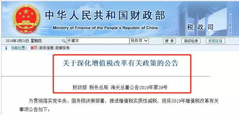 为贯彻落实党中央、国务院决策部署,推进增值税实质性减税,现将2019年增值税改革有关事项公告如下: