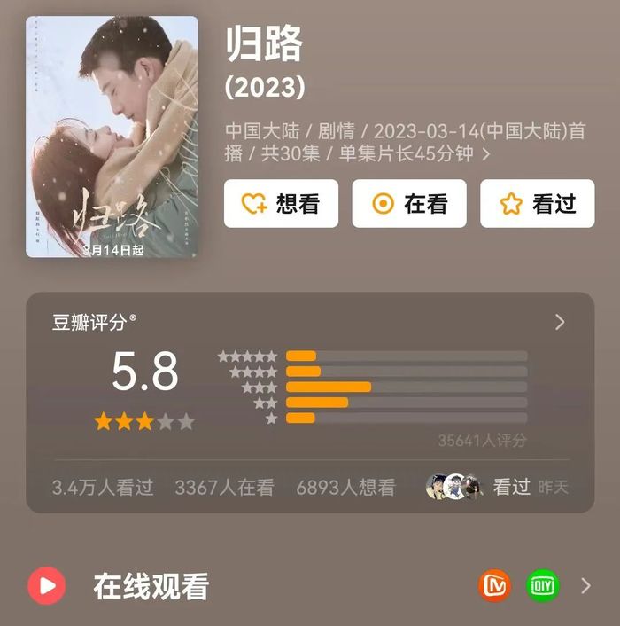 根据《2023年剧集网播表现及用户分析报告》,2023年,播放量top20的剧集里,芒果也仅有一部与爱奇艺拼播的《归路》,豆瓣也仅有5.8分,这也暴露出芒果在自制剧端较为乏力,过度依赖拼播,爆款稀缺等问题。