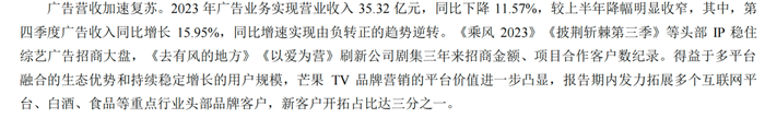 不过,多点开花的综艺,掩盖不了广告收入下滑的事实。2023年财报显示,芒果超媒2023年广告业务实现营收35.32亿元,同比下降11.57%,不知今年能否挽回颓势。