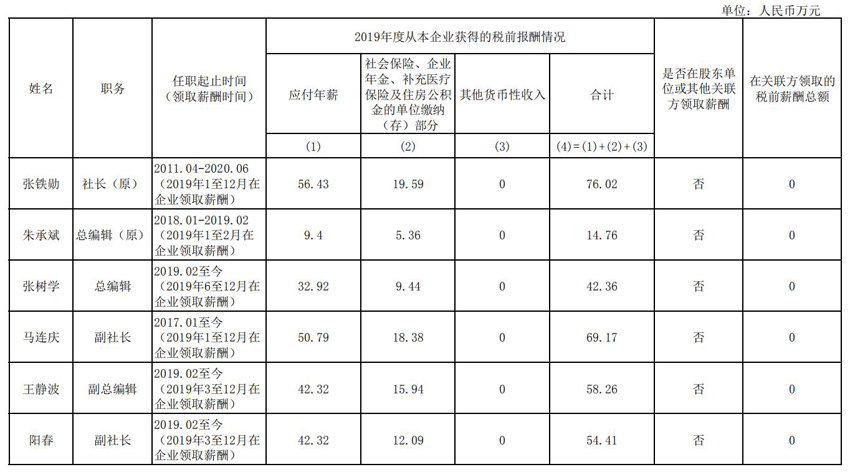 备注:上表披露薪酬为中国税务出版社企业负责人2019年度全部应发税前薪酬,其中第(1)项由国家税务总局核定。