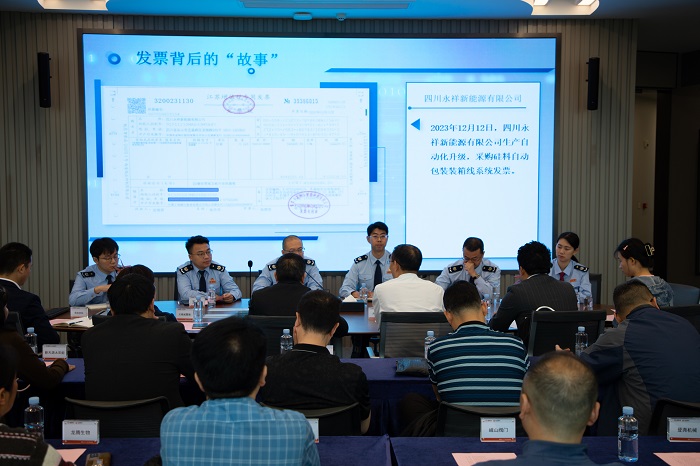 在“发票背后的故事”分享环节,四川永祥股份有限公司财务总监袁仕华表示,“这张发票是公司采购硅料自动包装装箱线系统时开具的,印证了企业生产智能化、自动化的发展过程”“税收数据的变化,往往也是企业发展的晴雨表,回想2022年,贡献税收超60亿元,如今行业发展进入‘寒冬’,企业更需要和期盼,财税部门一如既往的政策支撑。”