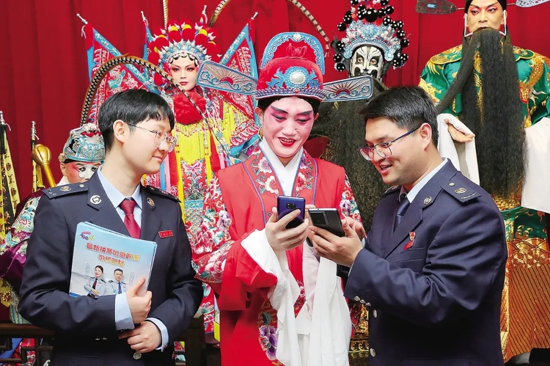 (近日,国家税务总局宝鸡市税务局第二税务分局税宣小分队走进宝鸡秦腔博物馆,借力国粹文化,开展税费政策宣传活动。图为税宣小分队队员向戏曲演员详细讲解社保费、个人所得税专项附加扣除标准等相关税收政策。陈显信 赵晶 摄)