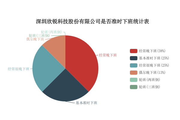 在深圳欣锐科技股份有限公司工作的人25%的反馈基本准时下班,12%的反馈偶尔晚下班,37%的反馈经常晚下班,25%的反馈经常很晚下班,具体见以下统计图。