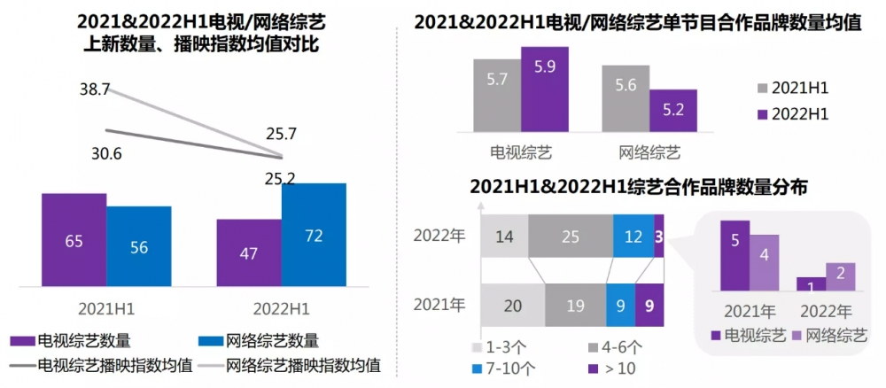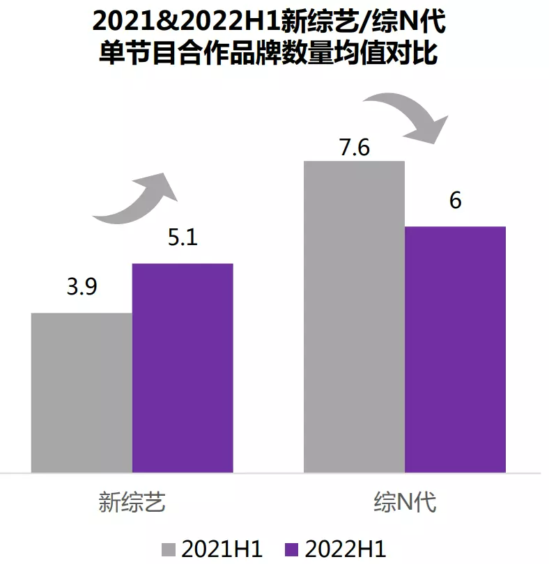 据艺恩数据的《2022上半年综艺赞助市场研究 》显示,上半年合作品牌超10个的综N代仅2部,不及去年同期的四分之一;新综艺虽整体吸金力较综N代略弱,但合作品牌超7个以上的“中坚力量” 增长较多,可以说此消彼长。