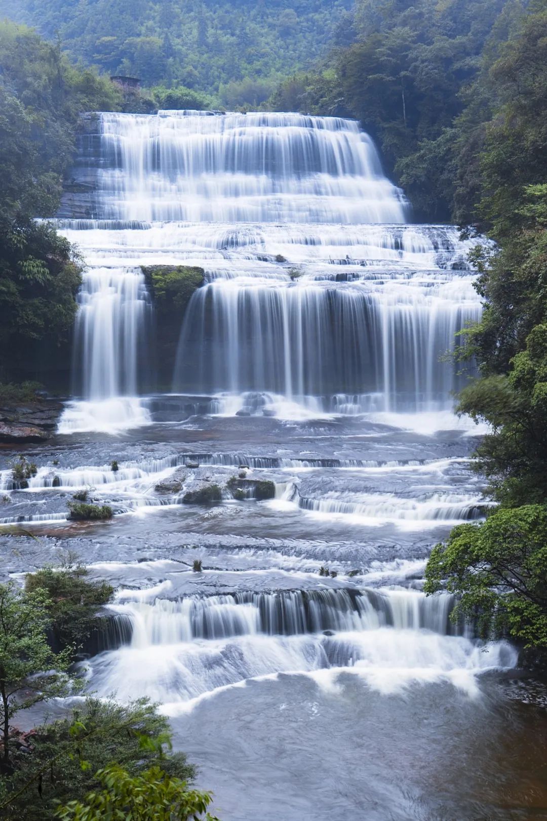 湍急的水流到丘陵地带逐渐减缓,沿着错落的山坡铺上一层层水帘。
