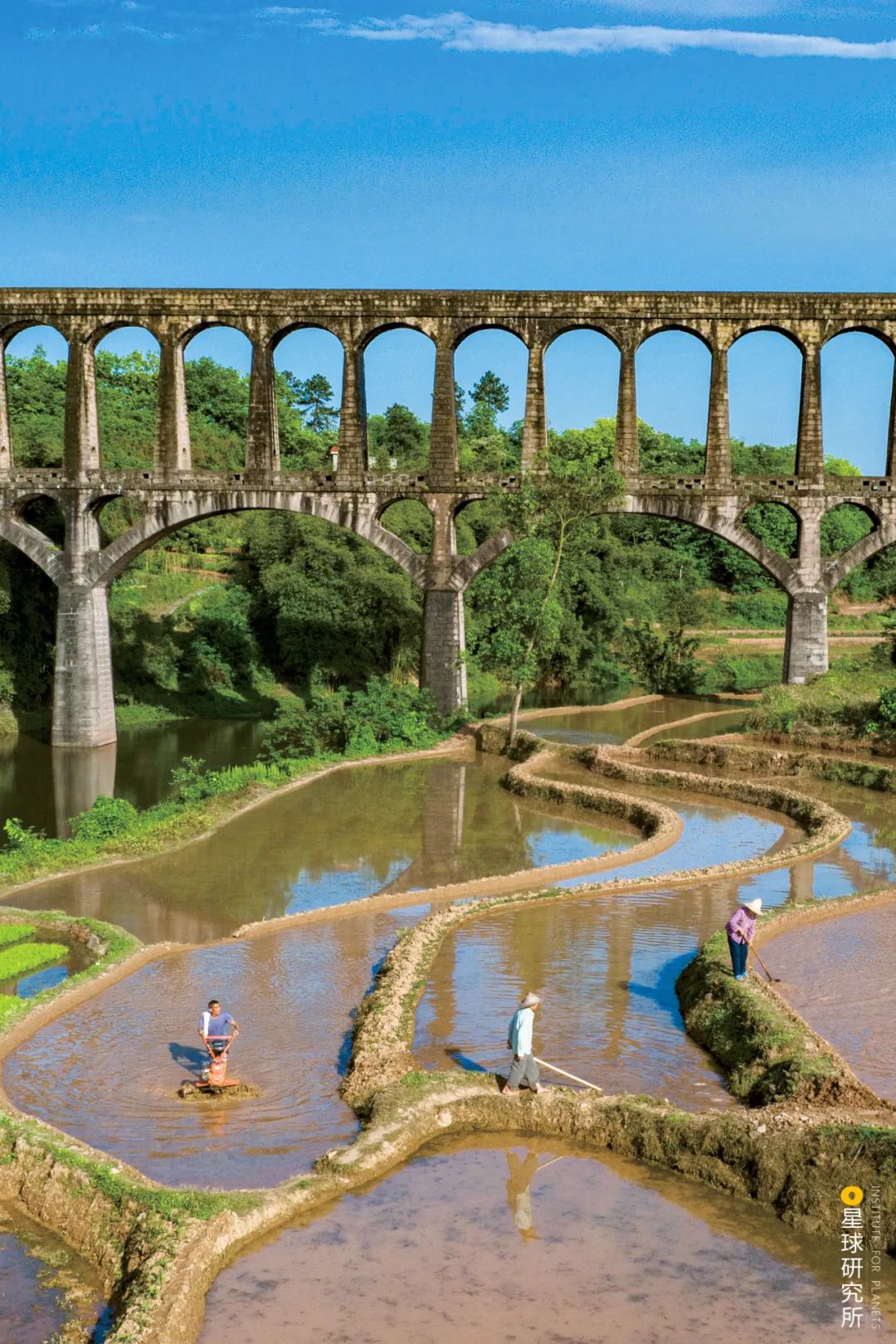 泸县奇峰渡槽,石拱桥梁跨越山丘,一头连接农田,一头连接水库 | 摄影师@王清友