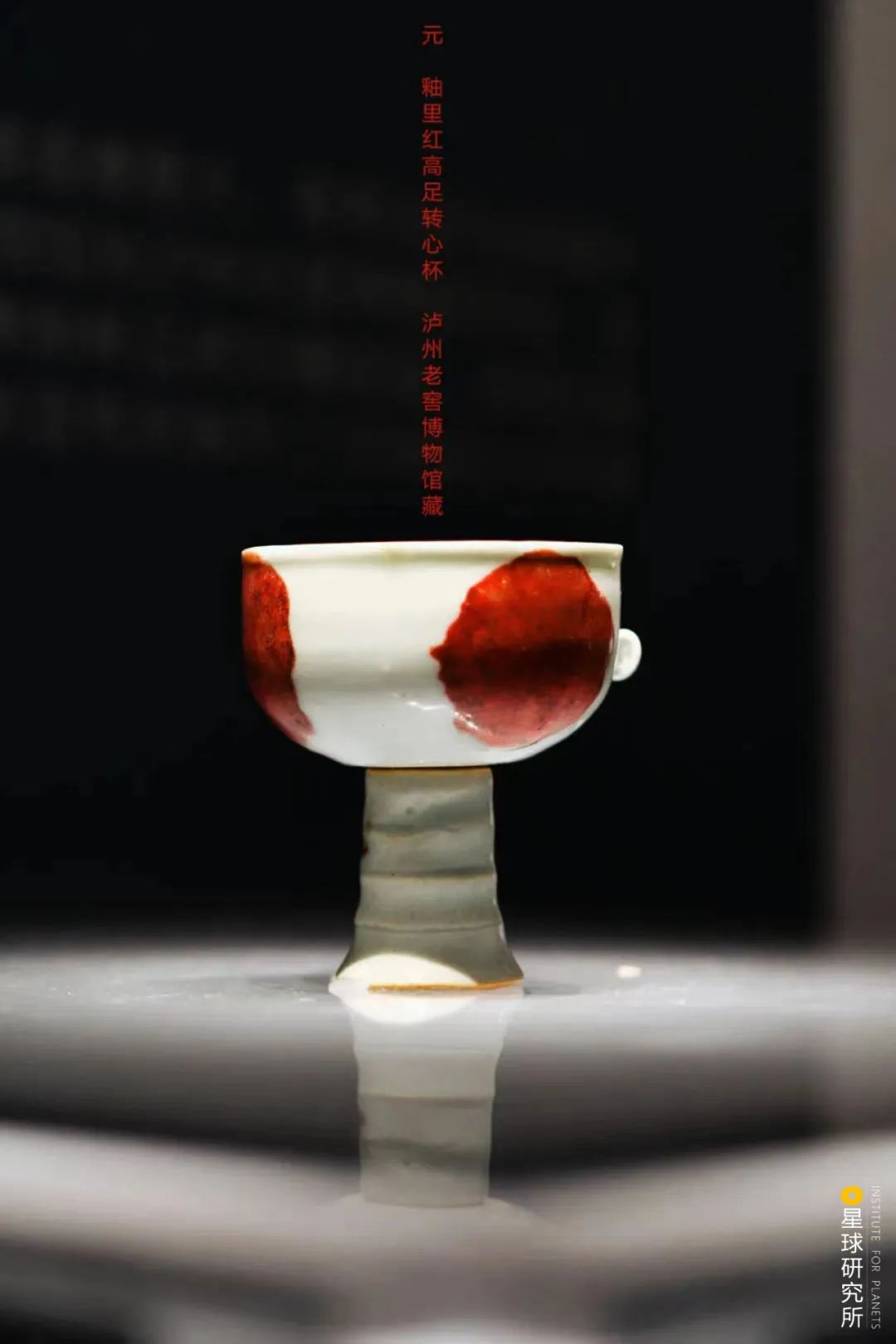 元代釉里红高足转心杯,红色的釉下彩有如花瓣。上文摘自苏轼《浣溪沙·夜饮》 | 图片来源@泸州老窖博物馆