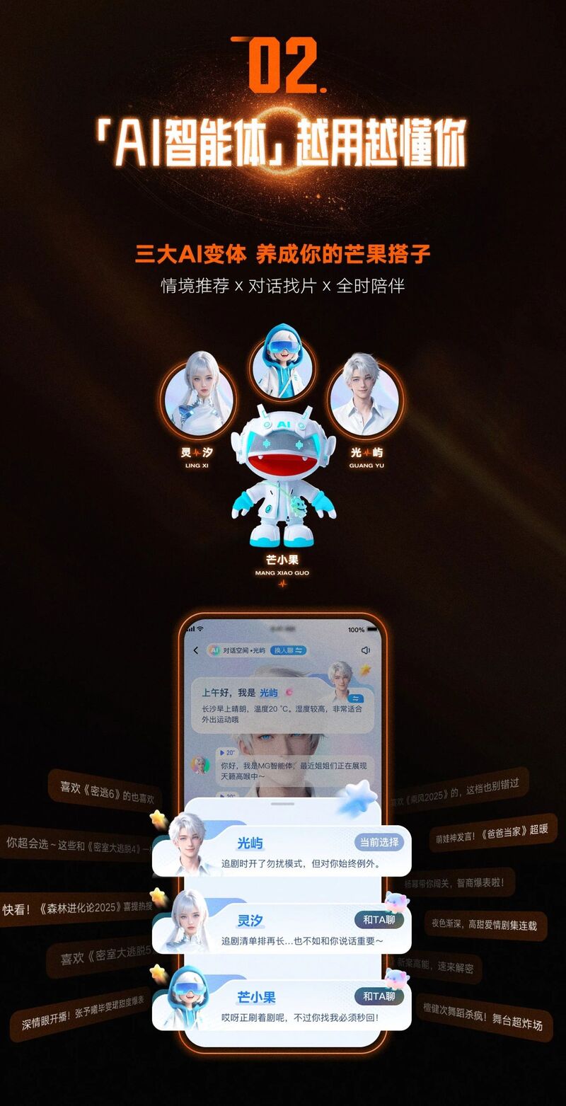 这一次,芒果TV不仅升级了推荐算法,更把陪伴落到实处——芒果AI智能体“芒小果”正式登场,还能依据你的喜好自由幻化成“灵汐”和“光屿”两个角色。这三个AI搭子不仅仅是功能化的助手,还是会与你对话、互动、共话追剧心情的虚拟伙伴。“芒小果”活泼,“灵汐”细腻,“光屿”更偏理性、专业。它们既能定制情境化片单,也能深聊剧情走向、解答演员信息等,更会持续学习理解你的喜好,成为越来越懂你的“智能搭子”。