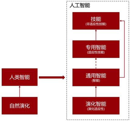 早期的人工智能研究,许多关注于用计算机解决问题,相关的计算机程序缺乏适应性,是本文中所说的“技能”;人们为特定问题设计的适应性方法,往往掺入了开发者对特定问题的经验,这些问题特定的经验不适用于“开放环境”,导致了“适应”的问题范围往往十分局限,但这些方法从应用角度来讲也十分有价值。同时,也有一些工作聚焦于与具体问题无关的原理,即“通用智能”,其旨在探索发生在人类、动物、群体、甚至可能存在的“外星人”等等的“心智”中的、复杂现象背后的、认识和改造世界的基本原理,这套原理的计算机实现被称为“通用人工智能”[6]。“通用智能”是否能由人工演化过程得来?是可能的,但演化中的适应性与人类身上的“通用智能”有着根本性的区别[7],由于篇幅限制,此处就不展开了。