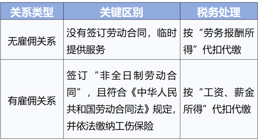 实务中,还有一种不太常见的情况——店家与招用的兼职者签订“非全日制劳动合同”。企业与兼职者签订“非全日制劳动合同”,且符合《中华人民共和国劳动合同法》第六十八条规定(每日工作不超过4小时,每周累计不超过24小时,以小时计酬为主),并依法缴纳工伤保险的,双方存在雇佣关系,兼职者取得的收入按工资、薪金所得处理。