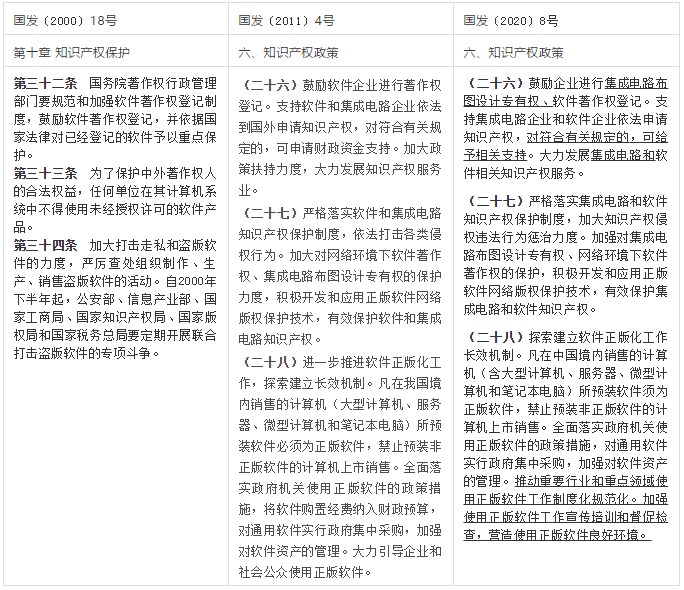 2011年的文件较2000年有了较大改变,将“知识产权保护”改为“知识产权政策”,首次将“集成电路”纳入了知识产权政策之中,也首次提出了“正版软件”这一概念,但是在顺序上,“集成电路”是排在“软件”之后的。