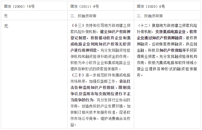 但2011年〔2011〕4号文中在"投融资政策"部分中首次出现了“知识产权质押”,此次《新时期政策》中,“知识产权质押”、“知识产权保险”也成为融资的手段。