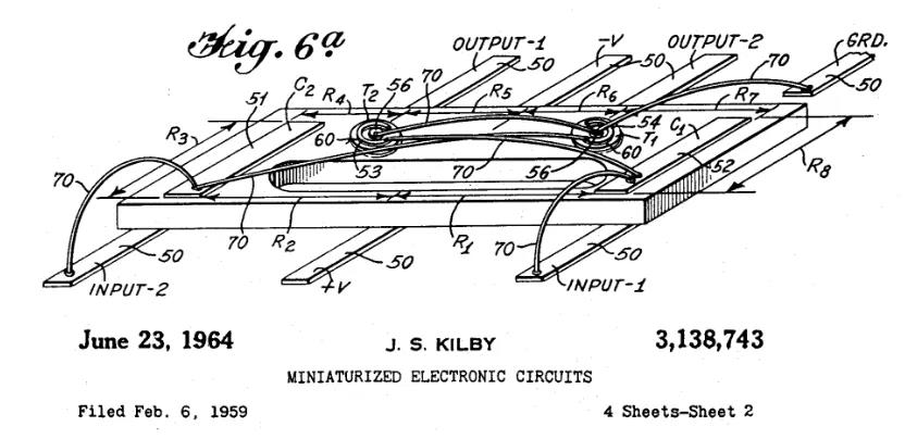 与此同时,德州仪器工作的基尔比(Kilby)也在1958年的工作记录中记录了微型电路可以在一块晶片上制造的工艺构思。德州仪器为了赶在其他竞争者申请专利之前,抢先在1959年2月提交了专利申请。