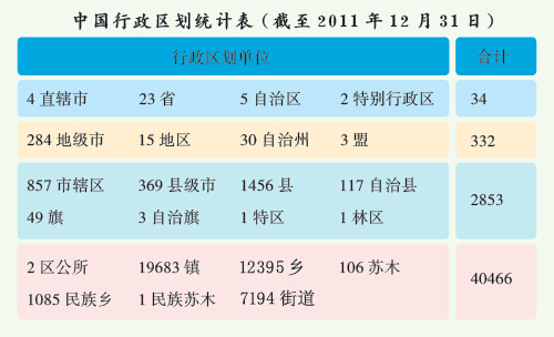 目前,全国行政区域分为省、自治区、直辖市、特别行政区。省、自治区分为自治州、县、自治县、市。县、自治县分为乡、民族乡、镇。直辖市和较大的市分为区、县。