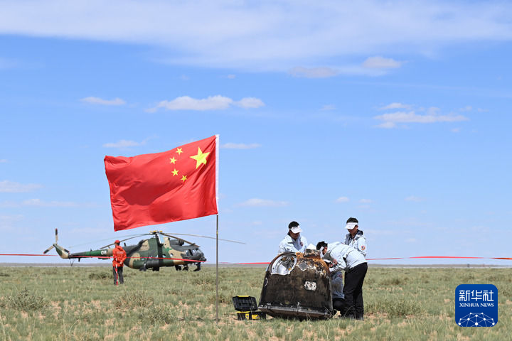 2024年6月25日,嫦娥六号返回器携带来自月背的月球样品安全着陆在内蒙古四子王旗预定区域,探月工程嫦娥六号任务取得圆满成功。新华社记者 贝赫 摄