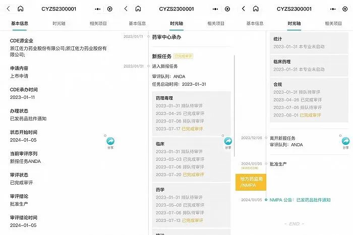 据丁香园Insight数据库,2023年1月11日,国家药品审评中心承办了佐力药业的百令胶囊项目。其审评内容包括药理毒理、临床、药学、合规部分,但并没有启动临床药理。同时,前述部分的完成审评的时间大都集中在2023年8月前。截至今年1月5日,这一产品被批准生产,由此形成了当前正式获批的局面。