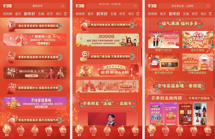 春节期间,芒果TV、湖南卫视特别策划“芒着接五福”新春特辑,以非遗、戏曲、文博等元素联动《国色芳华》《快乐再出发·山海季》等重点节目,实现破圈传播。大年初一到初七,湖南卫视全天时段均排名省卫第1,芒果TV日均日活用户同比上涨17%。