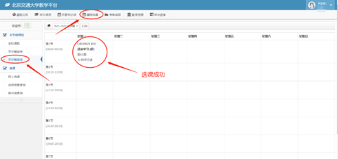 完成所有选课操作后,点击“本学期课表”,确认选课是否成功。成功选中的课程会出现在课程表中。