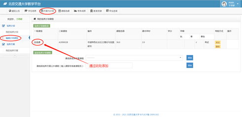 (1)通过方式二向培养计划课程列表中添加课程,系统会自动将所添加课程归入“自选课”课组。