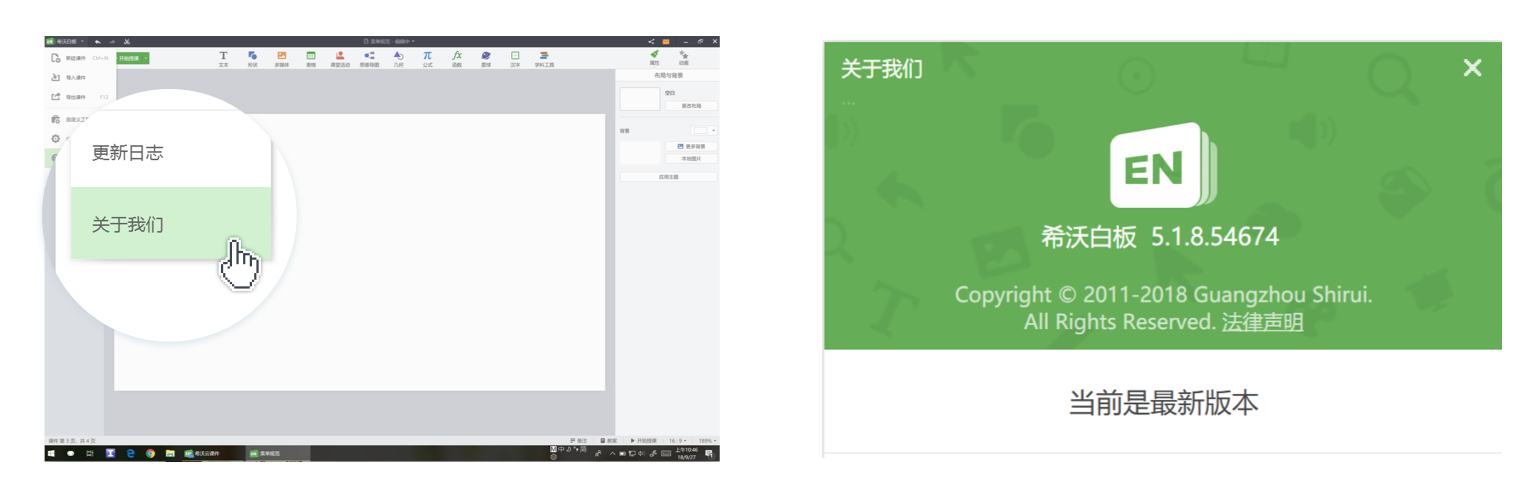 打开课件,点击左上角希沃白板-帮助-关于我们,即可查看目前版本,如果检查到最新版本即可按照提示更新