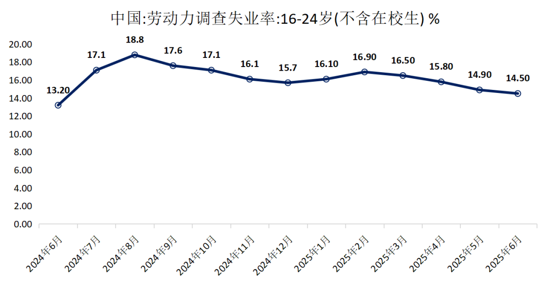 按年龄结构看,16-24岁(不含在校生)失业率6月份是14.5%,低于5月的14.9%,连续4个月下降。