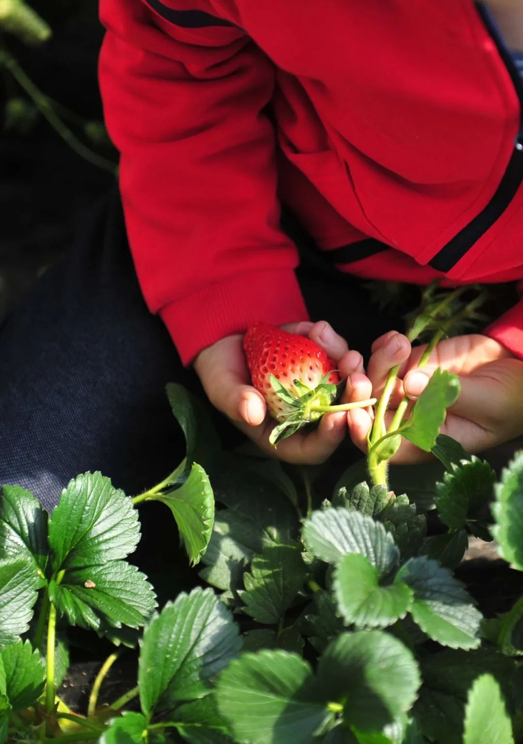 挎上篮子,瞄准草莓,迅速出手。一旦开始采摘,就一发不可收拾,手还在摘这个草莓,眼睛已经瞅上了另一个草莓。不知不觉间,已经收获了满满一筐红彤彤的果实。