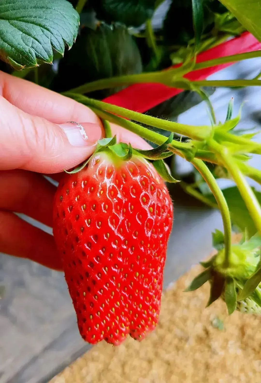 采摘草莓也有技巧,顺着草莓根茎,轻轻一掐,一颗新鲜果子就到手了。