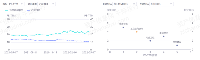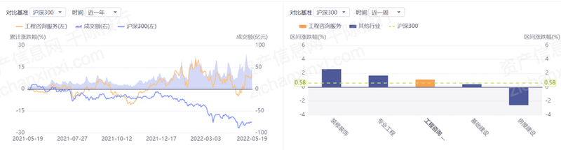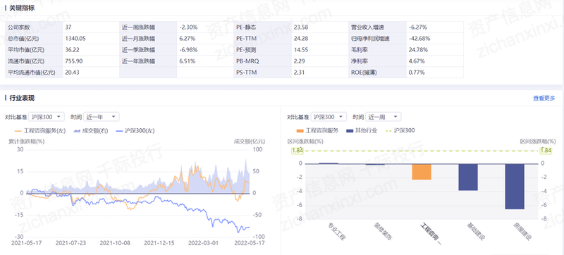 截止2022年5月20日,iFinD工程咨询板块沪深成分股个数为37,其中约有10家企业自年初起保持较大涨幅,涨幅整体呈现出下降趋势,员工总数约83180。2019年至今,工程咨询行业资产总额保持增长,至2021年底资产总额达到1144亿元,但利润总额逐步下降,2021年的净利润约为54亿元。截止2022年5月20日,该行业总市值为1352.46亿元。
