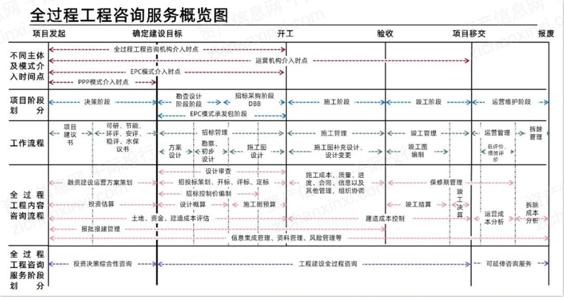 工程咨询是指为政府部门、项目业主及其他各类客户的工程建设项目决策和管理提供咨询活动的智力服务,包括前期立项阶段咨询、勘察设计阶段咨询、施工阶段咨询、投产或交付使用后的评价等工作。