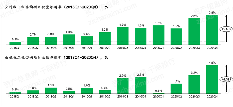 在政策强力驱动下,全过程工程咨询行业项目数量与项目金额的渗透率近三年均迅速提升,分别由0.3%、0.3%达到2.8%、4.8%。