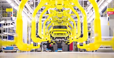 武汉经开区智能网联和电动汽车产业园的路特斯全球智能工厂,工人在流水线上作业。