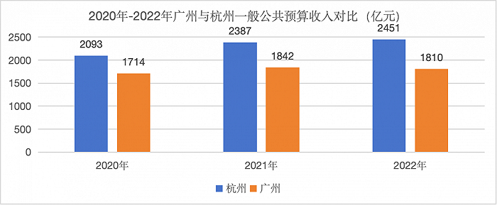 然而,两个城市的财政收入正好相反,2022年,杭州一般公共预算收入2451亿元,广州只有1810亿元;政府性基金收入方面,杭州3202亿元,广州1629亿元。由于地方政府性基金收入以国有土地使用权转让收入为主,和当地的房地产市场密切相关,因此下面仅讨论以税收收入为主的一般公共预算收入。