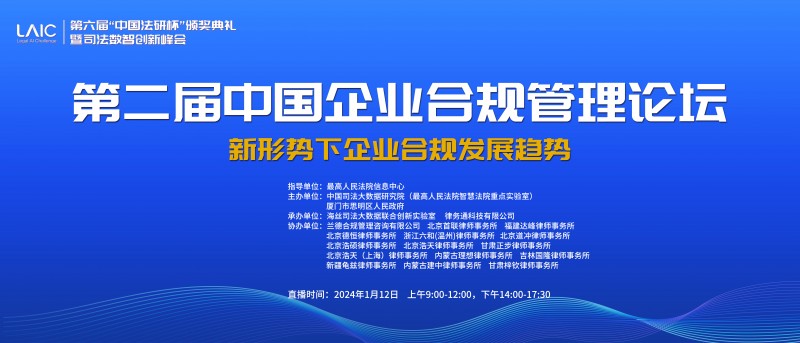 合规是安全之本,违规乃风险之源。伴随着全球经济增长疲软,国内经济在弱复苏中转型升级,数字化转型深入推进,创新技术应用不断升级,在经历了两年的“合规管理强化年”后,全球化背景下的中国企业将迎来怎样的合规风险挑战?企业的合规建设之路又将何去何从?2024年1月12日,第六届“中国法研杯”颁奖典礼暨司法数智创新峰会及第二届中国企业合规管理会议在“鹭岛”厦门成功举办。
