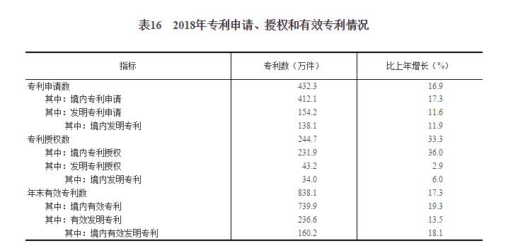 全年研究与试验发展(R&D)经费支出19657亿元,比上年增长11.6%,与国内生产总值之比为2.18%,其中基础研究经费1118亿元。全年国家重点研发计划共安排1052个项目,国家科技重大专项共安排563个课题,国家自然科学基金共资助44504个项目。截至年底,正在运行的国家重点实验室501个,累计建设国家工程研究中心132个,国家工程实验室217个,国家企业技术中心1480家。国家科技成果转化引导基金累计设立21支子基金,资金总规模313亿元。全年境内外专利申请432.3万件,比上年增长16.9%;授予专利权244.7万件,增长33.3%;PCT专利申请受理量[62]为5.5万件。截至年底,有效专利838.1万件,其中境内有效发明专利160.2万件,每万人口发明专利拥有量11.5件。全年共签订技术合同41.2万项,技术合同成交金额17697亿元,比上年增长31.8%。