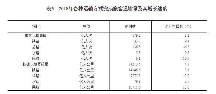 全年旅客运输总量179亿人次,比上年下降3.1%[33]。旅客运输周转量34213亿人公里,增长4.3%。
