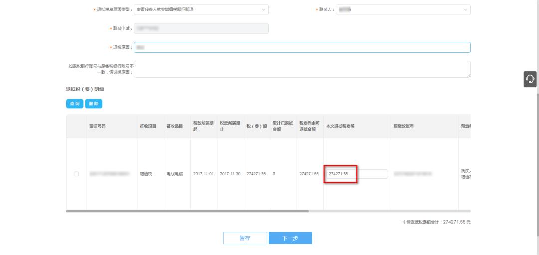 在主界面上填写[本次退抵税费额],确认无误后,点击[下一步]。