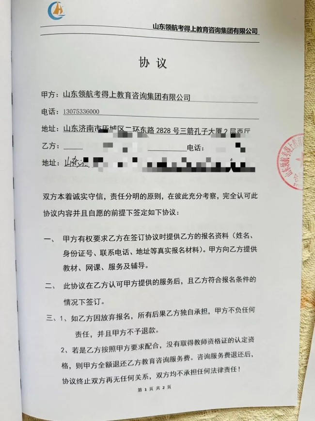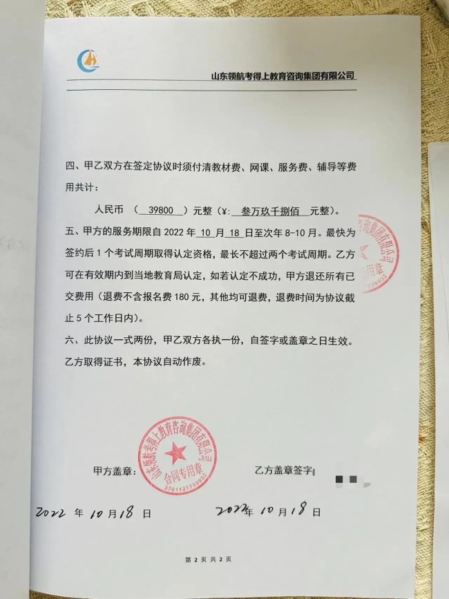我是山东省济南市的一名消费者。2022年,我在备考教师资格证的过程中,报名了更上教育集团(山东领航考得上教育咨询集团有限公司)的教师资格证咨询服务。合同规定更上教育集团向我提供教材、网课等服务,且在两个教师资格证报考周期内(2022年10月至2023年8-10月)获得教育局认定的教师资格证,否则全额退还服务费用39800元。在我签订合同并付款后,更上教育集团并未提供应有的培训服务,我也没能如期取得教师资格证。