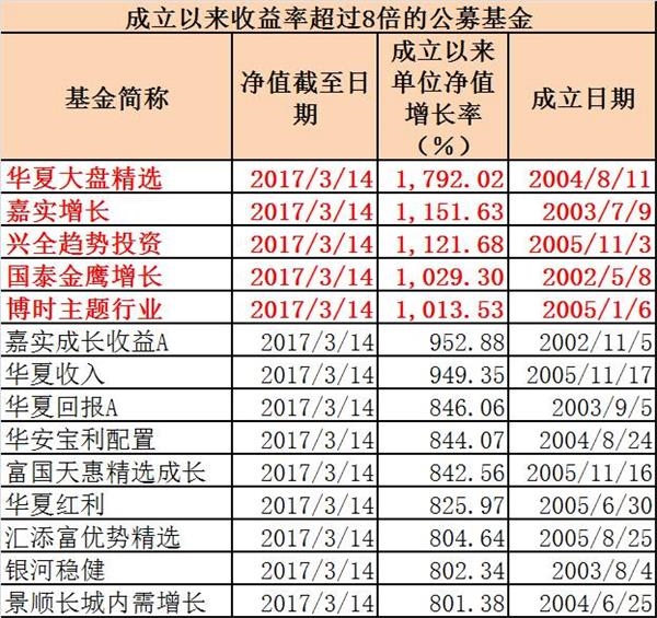 红榜:14只基金成立以来赚8倍以上