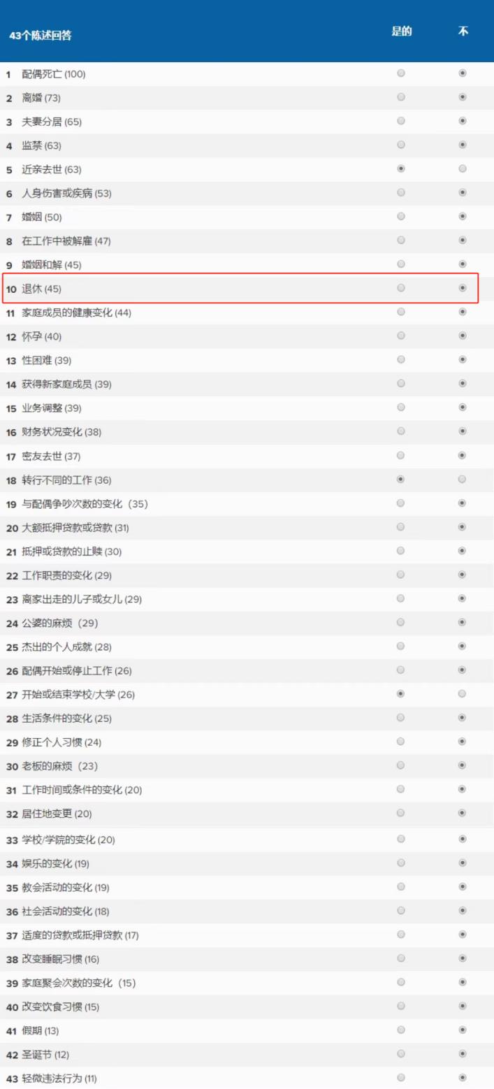 在美国医疗机构常使用于评估压力的心理健康测量工具——社会再适应评定量表(Social Readjustment Rating Scale)归纳的43件生活压力事件排名中,“退休”位列第十。