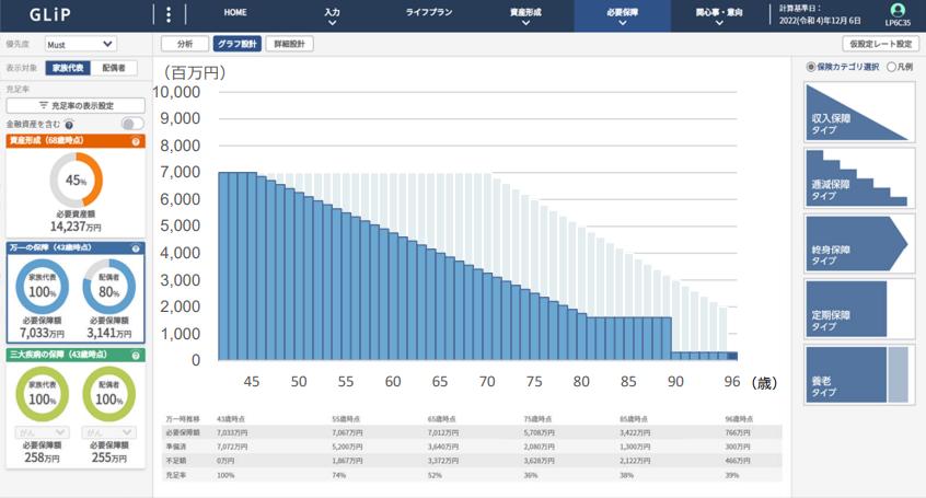 实现重要风险的“可视化”:GLiP将退休风险分为“必要资产”“突发情况”“三大疾病”,并给出各风险所需的金额。通过家庭收支现状可视化,直观反映重要风险,并提供解决方案。