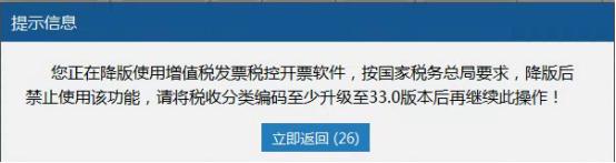 六、使用税务Ukey开具发票提示,“您正在降版使用增值税发票开票软件,按国家税务总局要求,降版后禁止使用该功能,请将税收分类编码至少升级至最新33.0版本后再继续此操作”提示信息,请问该如何处理?