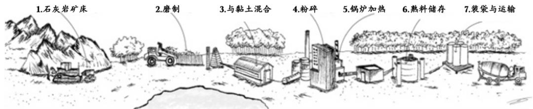 这是该地区最早的综合性水泥厂之一。与当时更常见的磨制厂不同,综合性水泥厂的水泥产自当地的石灰石矿。一旦提取出来,石灰石与黏土按照80-20的比例混合。将物质加热至1450°C,制成被称为“熟料”(clinker)的小块状中间产品。然后将这种坚固的熟料粉碎并与石膏混合,制成我们称之为“波特兰水泥”的灰色粉末。磨制厂只执行混合熟料和石膏的第二阶段,这里的原材料往往进口自欧洲或北非。