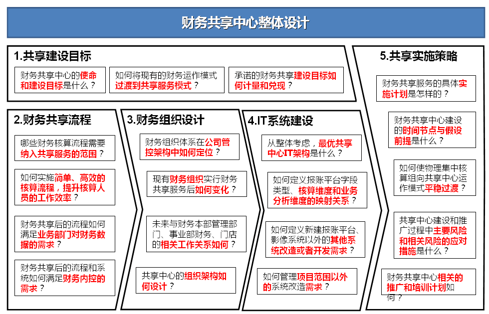 财务共享服务中心建设方案具体要解决以下问题,财务共享中心是什么?--组织定位问题;财务共享中心怎么建?--组织模式问题;财务共享中心做什么?--业务内容问题;财务共享业务谁来做?--组织岗位问题;财务共享业务怎么做?--业务操作问题;财务共享业务在哪儿做?--共享中心选址问题;财务共享业务如何合法的做?--法律合规问题;财务共享中心业务如何使用信息系统?--软件选择问题。