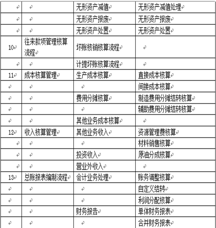 经过对勘探公司核算业务的梳理,共梳理了一级业务13个一级流程,包括费用与报销管理、存货管理、薪酬管理、工程结算管理、资金管理、税费管理、油气资产管理、固定资产管理、无形资产管理、往来账款管理、生产成本管理、收入核算管理、总账报表编制流程,将纳入财务共享服务中心处理。具体流程清单如下: