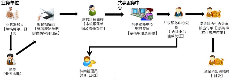 应付挂账--录入应付的流程就是业务员在系统里面录入一个应付单,扫描原始单据,由业务领导审核,业务会计初核,进入共享中心进行审核、复核,生成总账凭证。下面我们看一个付款的流程,就是业务人员录入付款申请单,扫描原始单据,审核申请,业务会计初核,进入到共享服务中心审核、复核。