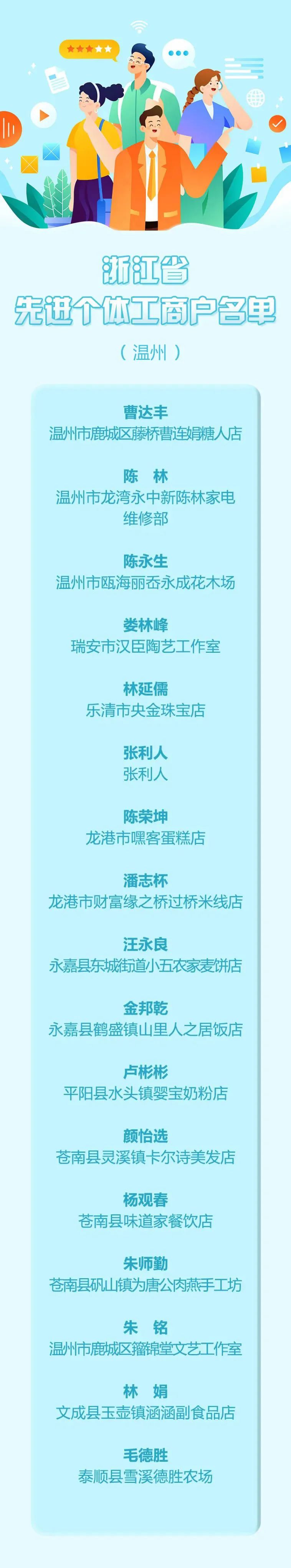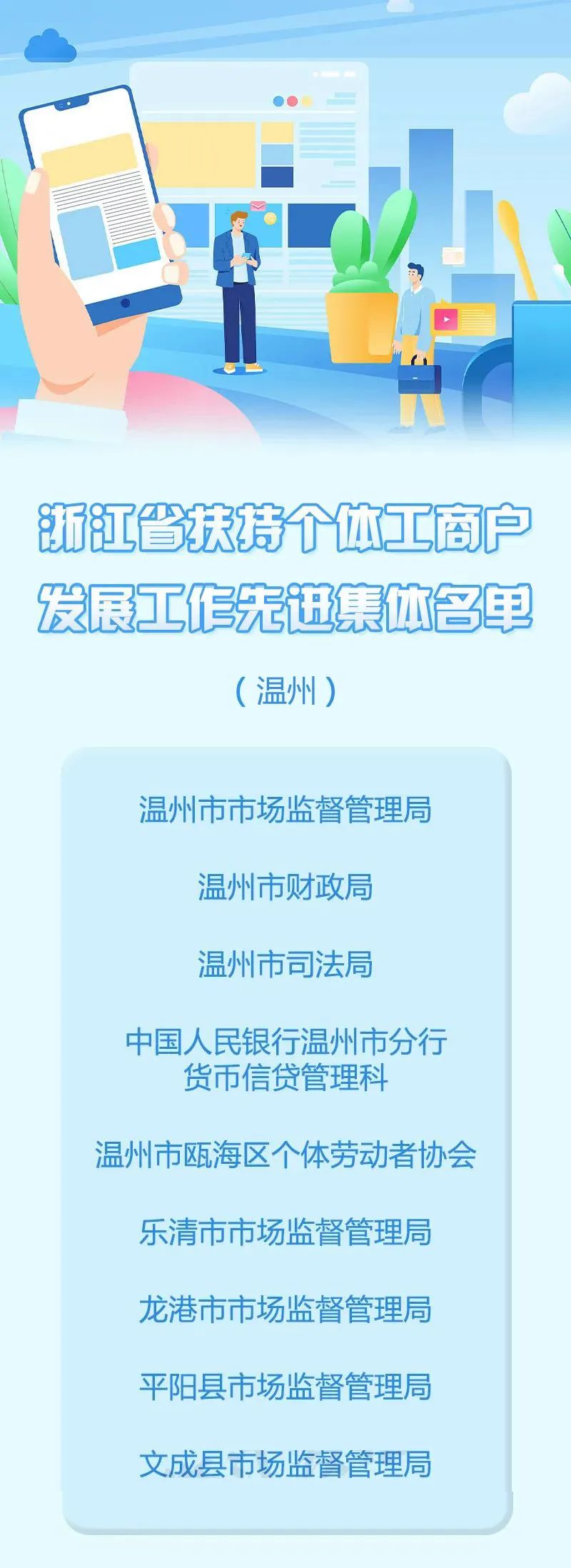 近日,《关于表彰浙江省先进个体工商户和浙江省扶持个体工商户发展工作先进集体的决定》印发,温州曹达丰等17名个人获“浙江省先进个体工商户”荣誉称号,温州市市场监督管理局等9个集体获“浙江省扶持个体工商户发展工作先进集体”称号。