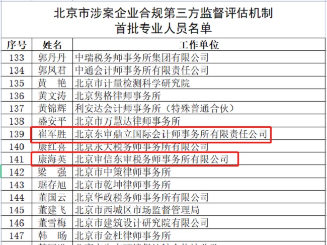 作为一个综合性财税服务机构,企业合规性与财务风险管控一直都是东审财税专业研究中的重要内容。作为会计师事务所和税务师事务所首批获聘专业人才,崔军胜、康海英同志高度关注企业财税合规工作。今后也将发挥财税领域专业人才的特长与优势,配合第三方监督评估机制的运行,为北京市企业合规建设及服务经济社会的高质量发展贡献专业力量。