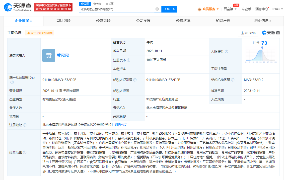 近日,记者从天眼查App获悉,北京高途云途科技有限公司成立,法定代表人为黄露露,注册资本1000万人民币,经营范围包括会议及展览服务、计算机系统服务、健康咨询服务、自费出国留学中介服务、互联网信息服务等。