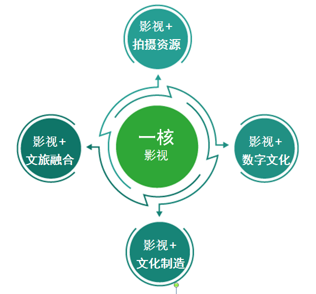 三、全域化产业体系按照“一核四极”的产业框架构建全域化产业格局:“一核”即坚持以影视创作生产传播为核心主业;四极,指打造“影视+拍摄资源”“影视+数字文化”“影视+文化制造”和“影视+文旅融合”等四大增长极。