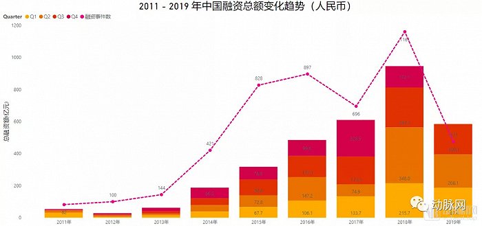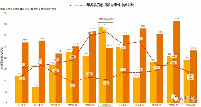 1、中国融资总额一度领先美国100亿人民币,融资数量本季度已实现反超